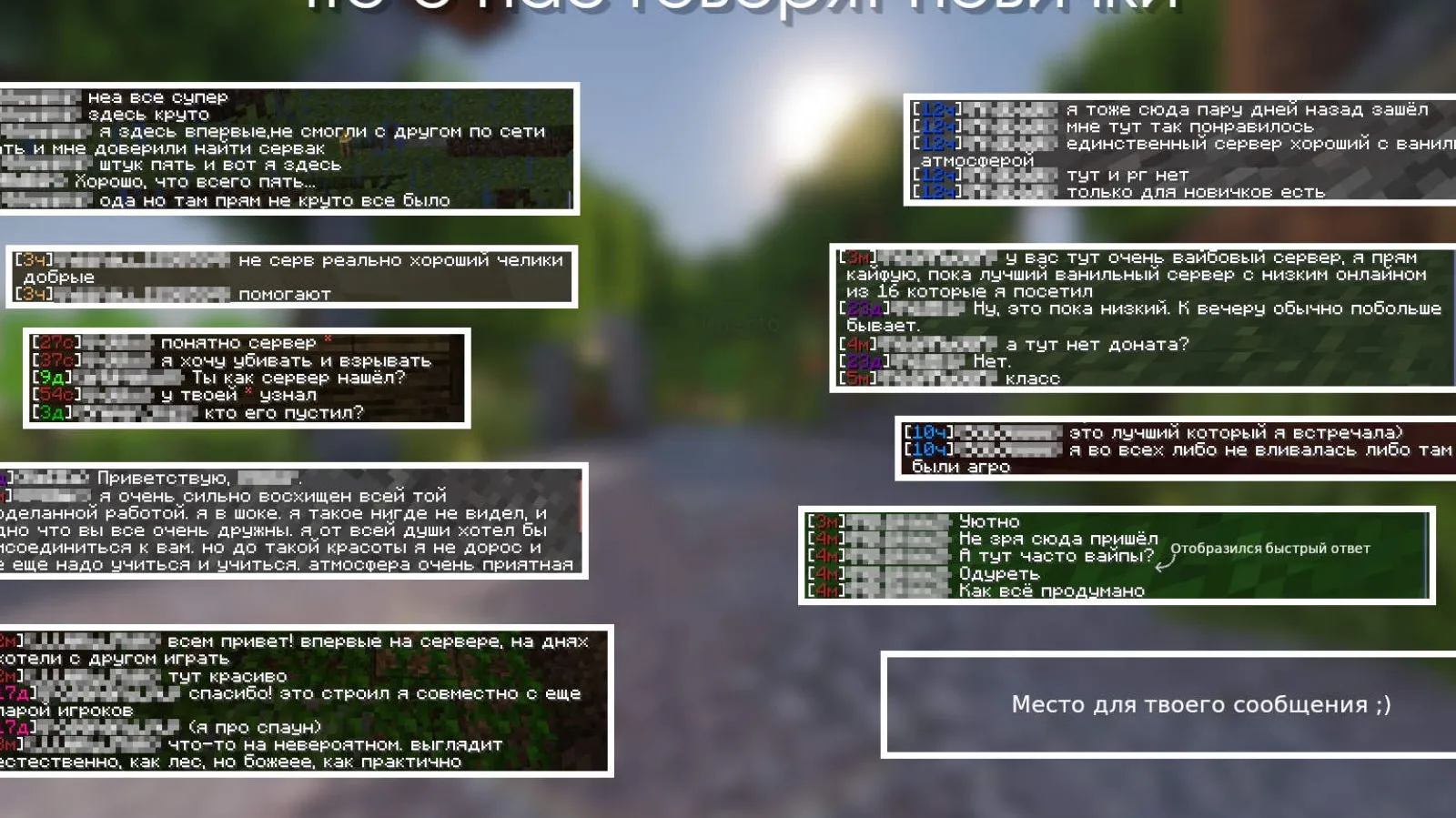 Community is our feature. Friends connected beyond Minecraft. Events, joint raids on Wither and dragon. Nostalgia for vanilla without toxics.