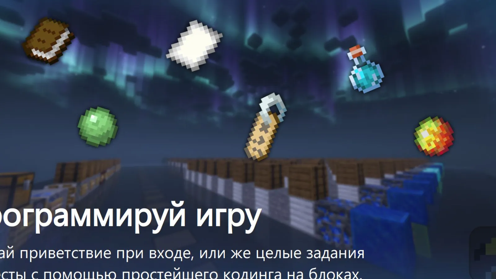 Coding is simpler than it seems. Place a block — and give items on tap, greet noobs at entry. Master variables, lists, dictionaries — and your map will come alive. Facts: 50 player events (clicked, entered, died), 70 actions on them (give sword, teleport), 30 conditions for checks. This is the base for your own game!