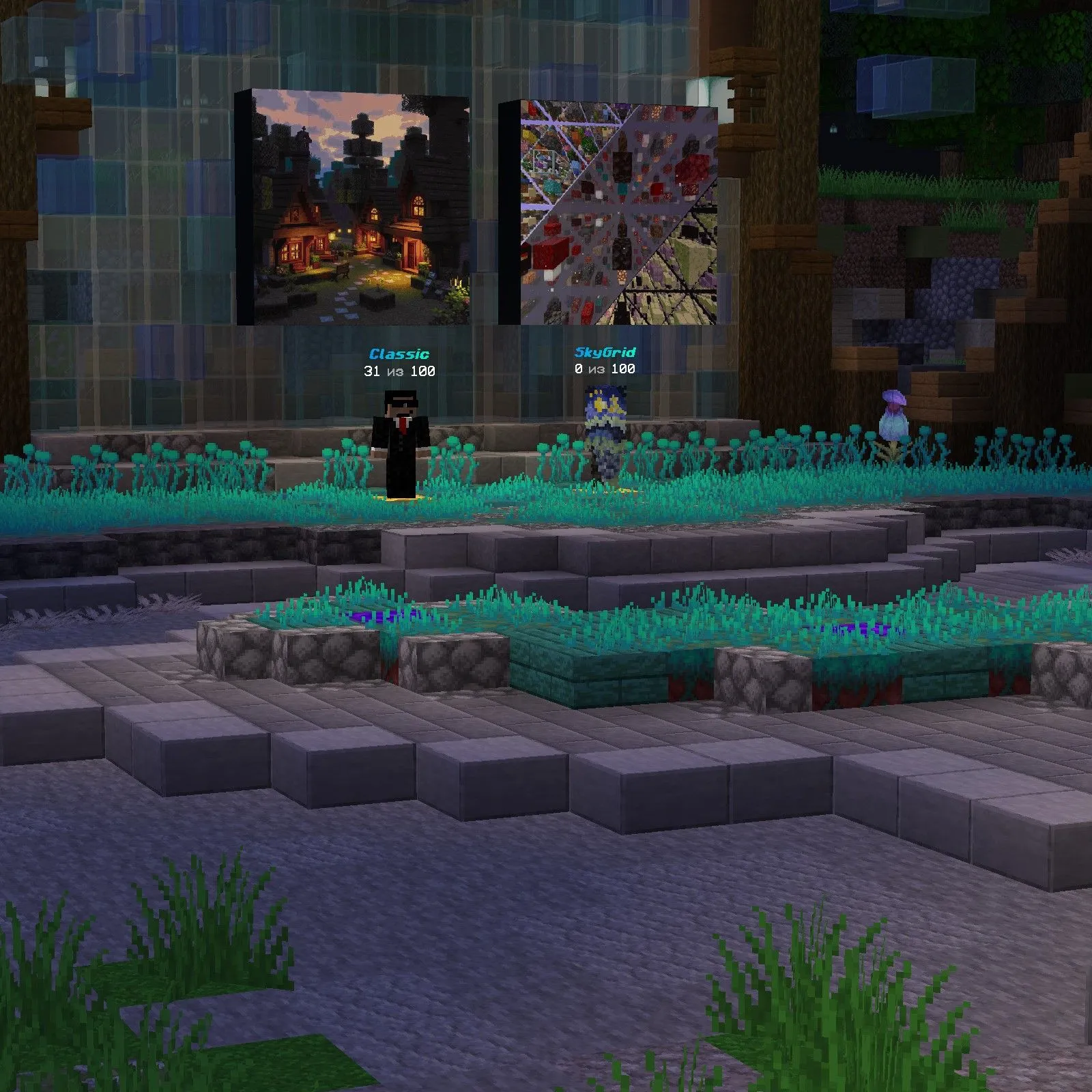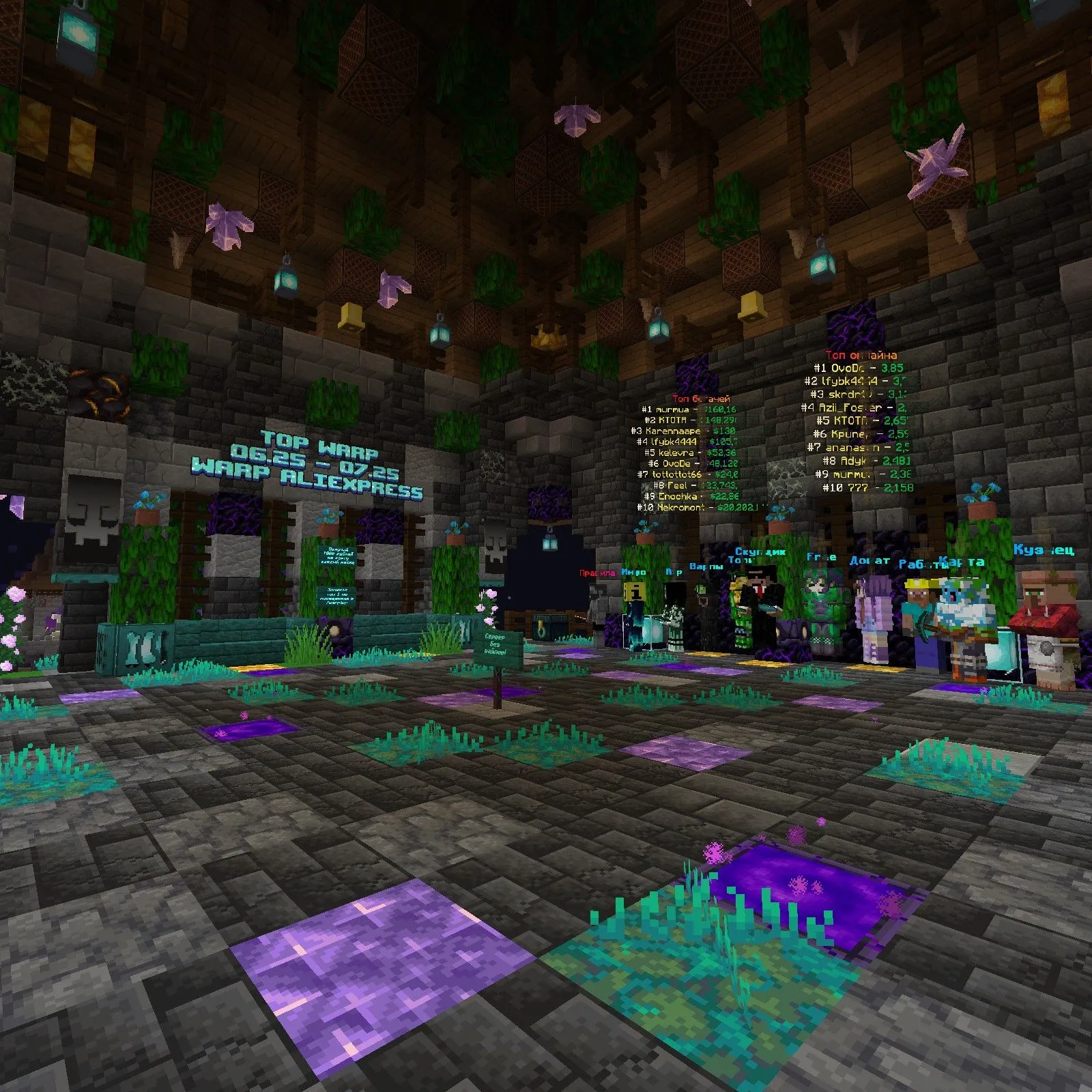 Buyer snaps up your mob-farms at fat prices. Jobs pump up the economy. Shops on chests — trade with anyone. Warps: everyone sets their own for free, one per player. Donat? Buy with in-game currency, fair exchange rate, no imba kits, OP or fly. No donat-OP — all equal.
