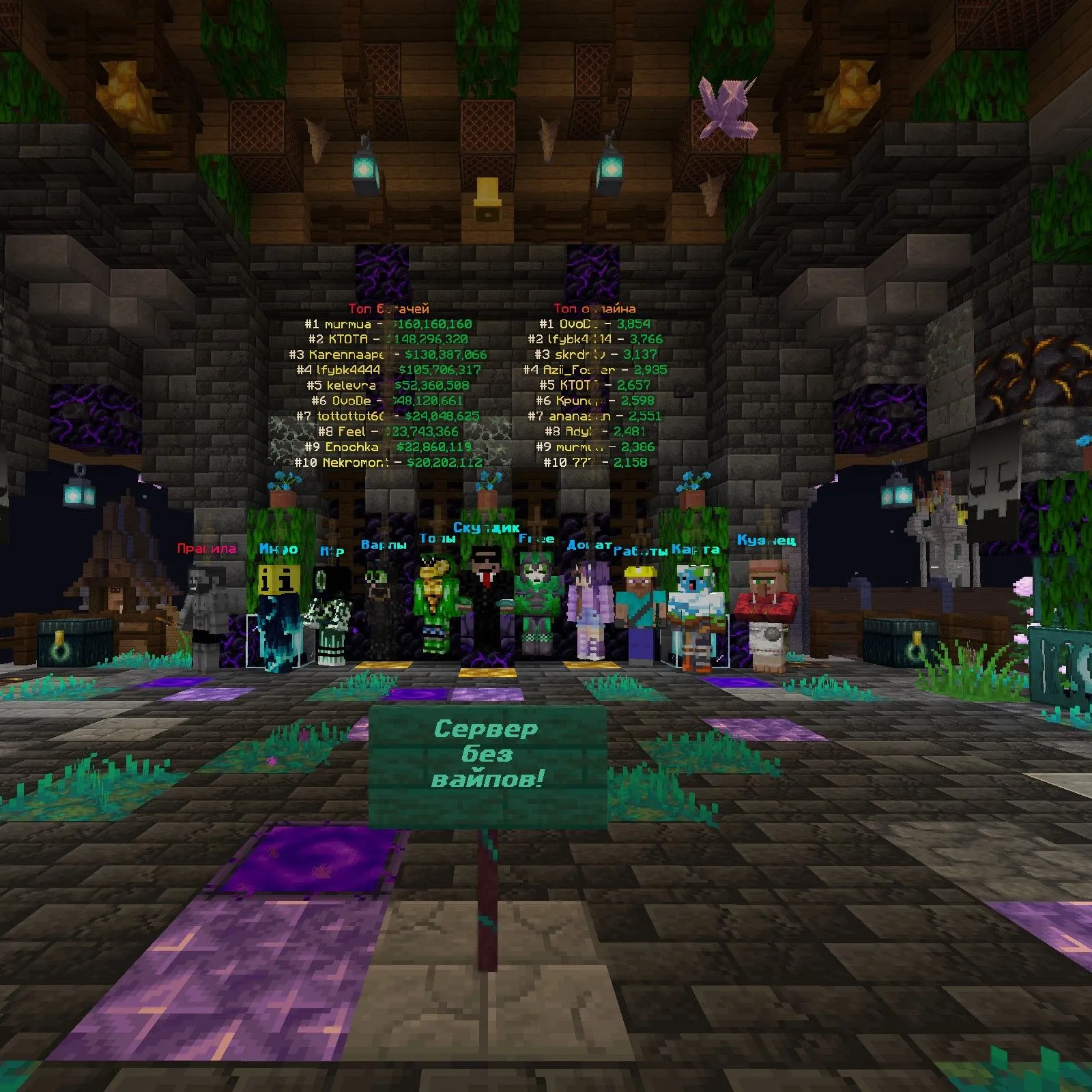Imagine: classic survival where your farms and castles stand for years. No wipes. Ever. No PVP in the world — only on the arena for blowing off steam. Grief? Forget it, privates up to 3 million blocks keep everything safe. Cheaters? We ban them instantly. Community — all adequate folks, from newbies to hardcores.