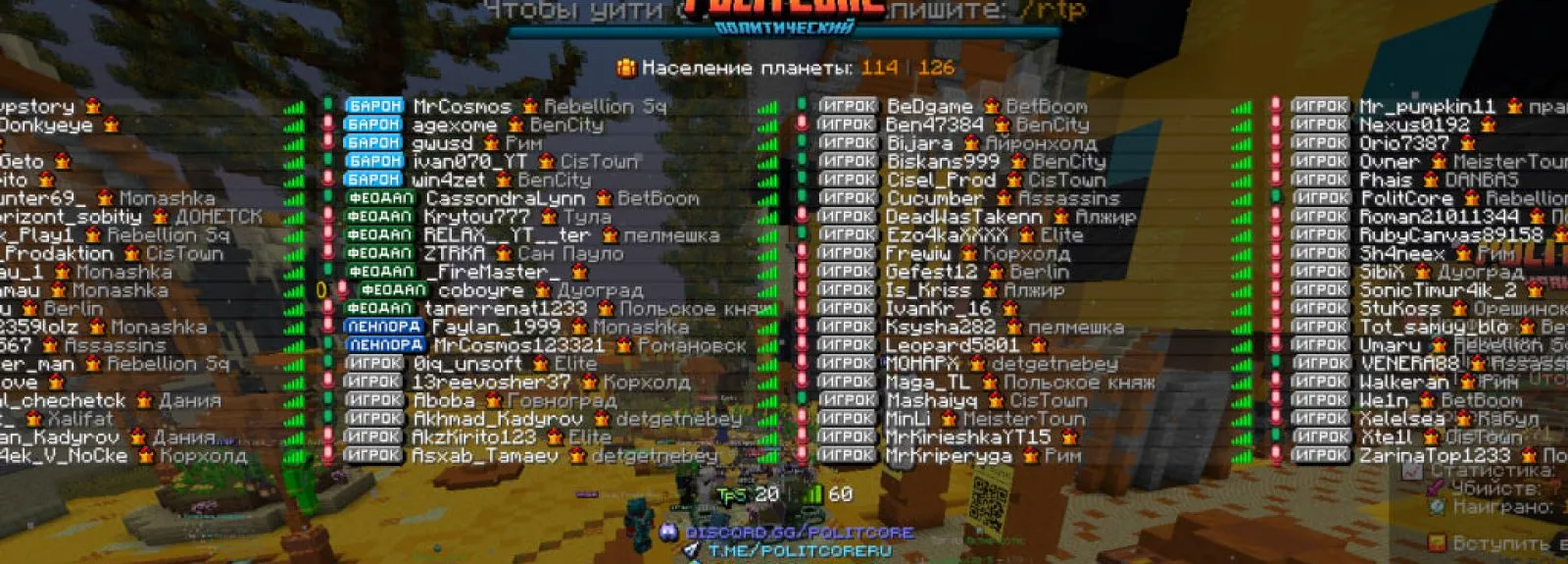 Imagine: politics, wars, and ambitions right in the cubic world of Minecraft. Create your own nation, conduct diplomacy with neighbors, develop the economy, and tear enemies apart in epic territory captures. The real world map awaits you. Form ⚔ alliances, wars, and pacts. Complete freedom of action — no scripted events, only your moves change the server's history. We support versions 1.16-1.21.12+. Join via IP: mc.politcore.ru or eu.politcore.net:19132. Plasmo Voice voice chat — communicate in real time, coordinate raids without lag. Join right now — history is written by you. TG channel: @politcoreru. Building empires together!